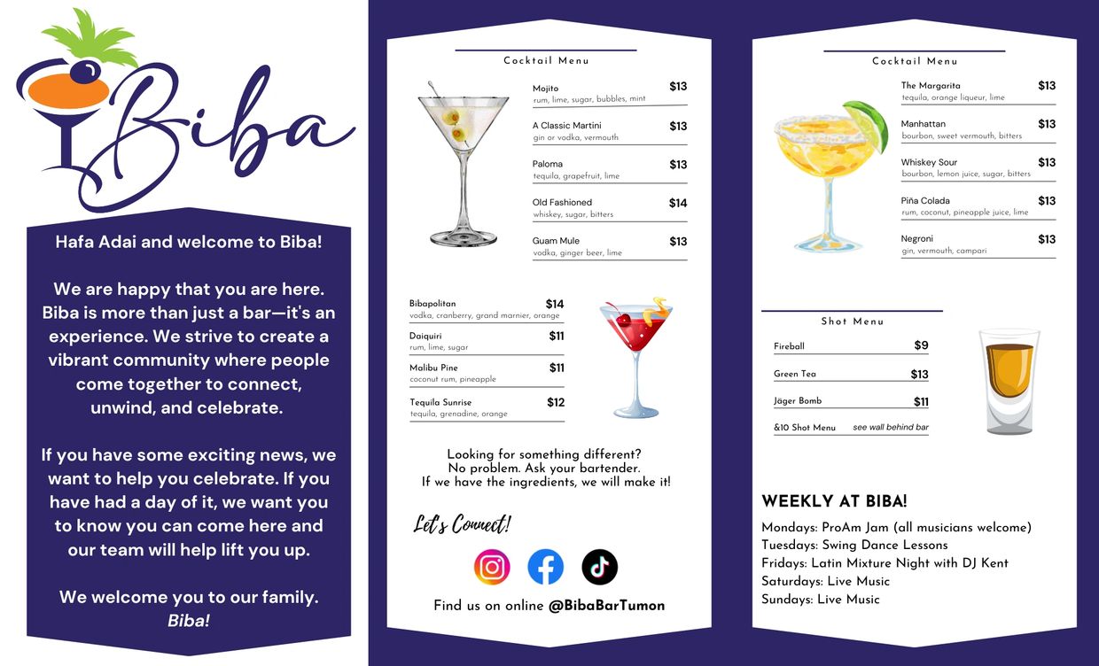 At Biba, our cocktails are more than just drinks—they’re experiences. Our bartenders craft each cocktail with precision, passion, and a touch of island flair. Whether you’re sipping on a refreshing tropical creation or a time-honored classic, every pour is made with top-quality spirits, fresh ingredients, and a dedication to perfection.